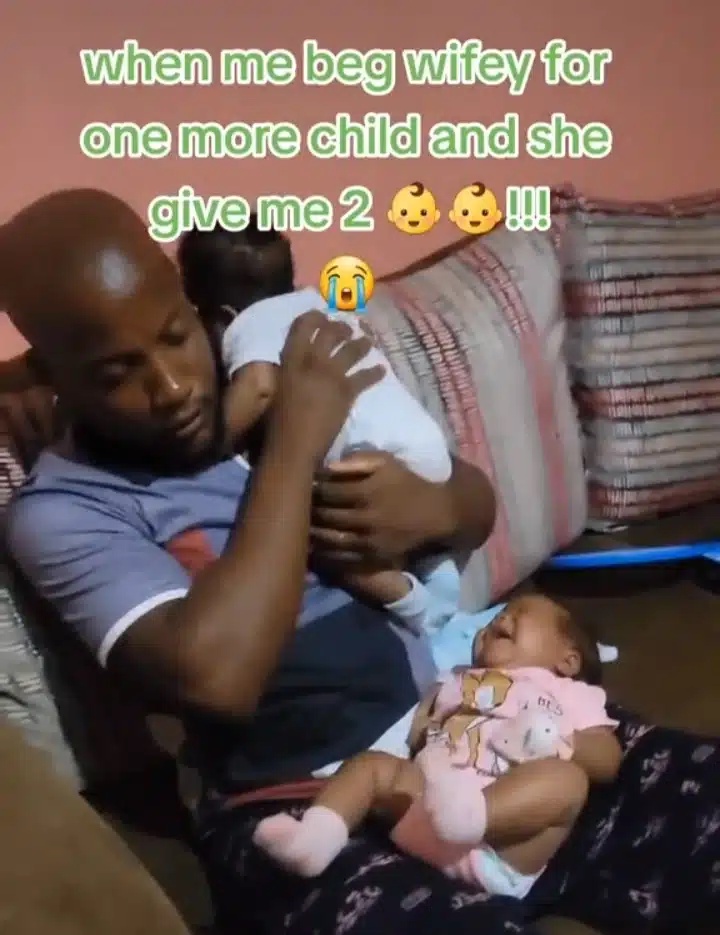According to the man identified with the handle @mr_and_mrs_levy on TikTok he asked his wife to deliver one more child but she delivered twin babies.