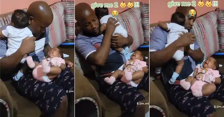 The video has stirred massive reactions from many parents who spoke about the challenges of taking care of twins. Others made jest of the young man as his wife handed the babies over to him to take care of them.